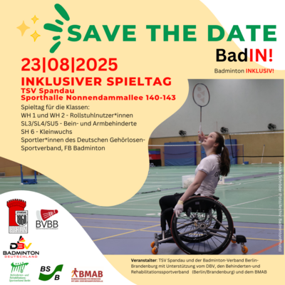 Am 23.08.2025 findet in der Sporthalle der Knobelsdorff-Schule in Berlin ein inklusiver Spieltag im Para Badminton statt. Es ist jede und jeder herzlich eingeladen daran teilzunehmen, egal ob schon eine offizielle Klassifizierung vorliegt oder nicht. Wenn das nicht der Fall ist, erfolgt eine Einschätzung der Behinderung direkt vor Ort.