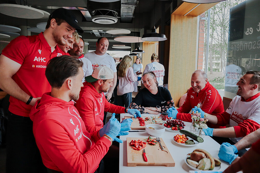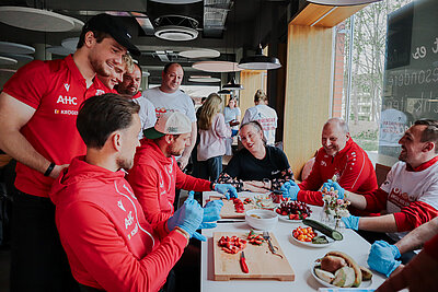 Den Auftakt bildete der Besuch von sechs Spielern des FC Energie Cottbus im Café Nascherei der Lebenshilfe Werkstätten Hand in Hand. Hier erhielten die Spieler praxisnahe Einblicke in die tägliche Arbeit vor Ort. Gemeinsame Aktivitäten, wie das Herstellen von Schokolade, zeigten, wie Zusammenarbeit auf Augenhöhe im Alltag funktioniert. Abgerundet wurde der Tag mit einer Autogrammstunde.